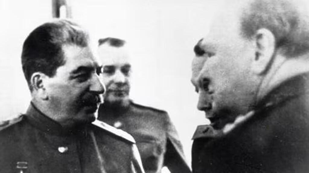 Le 23 août 1939, contre toute attente, Staline signe avec Hitler le pacte germano-soviétique, dit Molotov-Ribbentrop. Cet accord de non-agression s’accompagne d’un protocole secret : les deux dictatures se partagent l’Europe de l’Est. Peu après, Hitler envahit la Pologne à l’ouest, et Staline envoie ses troupes à l’est. Il annexe les Pays baltes, la Bessarabie, et attaque la Finlande durant la guerre d’Hiver (1939–1940), où l’Armée rouge subit de lourdes pertes.