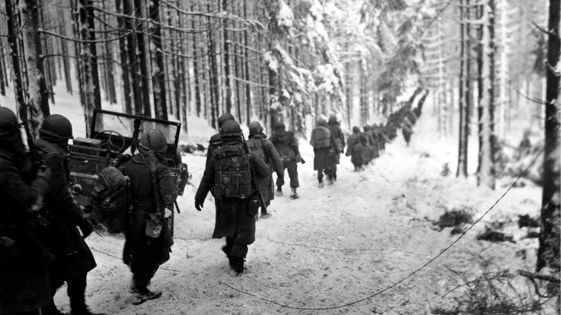Toutefois les Allemands n’ont pas encore perdu la guerre. À l’automne, la ligne de front se stabilise aux frontières de l’Allemagne. Hitler, désespéré, ordonne une offensive à l’Ouest. En décembre 1944, dans les Ardennes, il lance l’opération Wacht am Rhein : une percée audacieuse entre les lignes alliées, dans la neige, le froid, le brouillard. C’est la bataille des Ardennes. Les troupes américaines, surprises, reculent. Bastogne, encerclée, tient grâce à la résistance héroïque de la 101e division aéroportée. Mais les Alliés réagissent vite. L’offensive allemande échoue. Les réserves de la Wehrmacht sont saignées à blanc. C’est le dernier sursaut du Reich à l’Ouest.