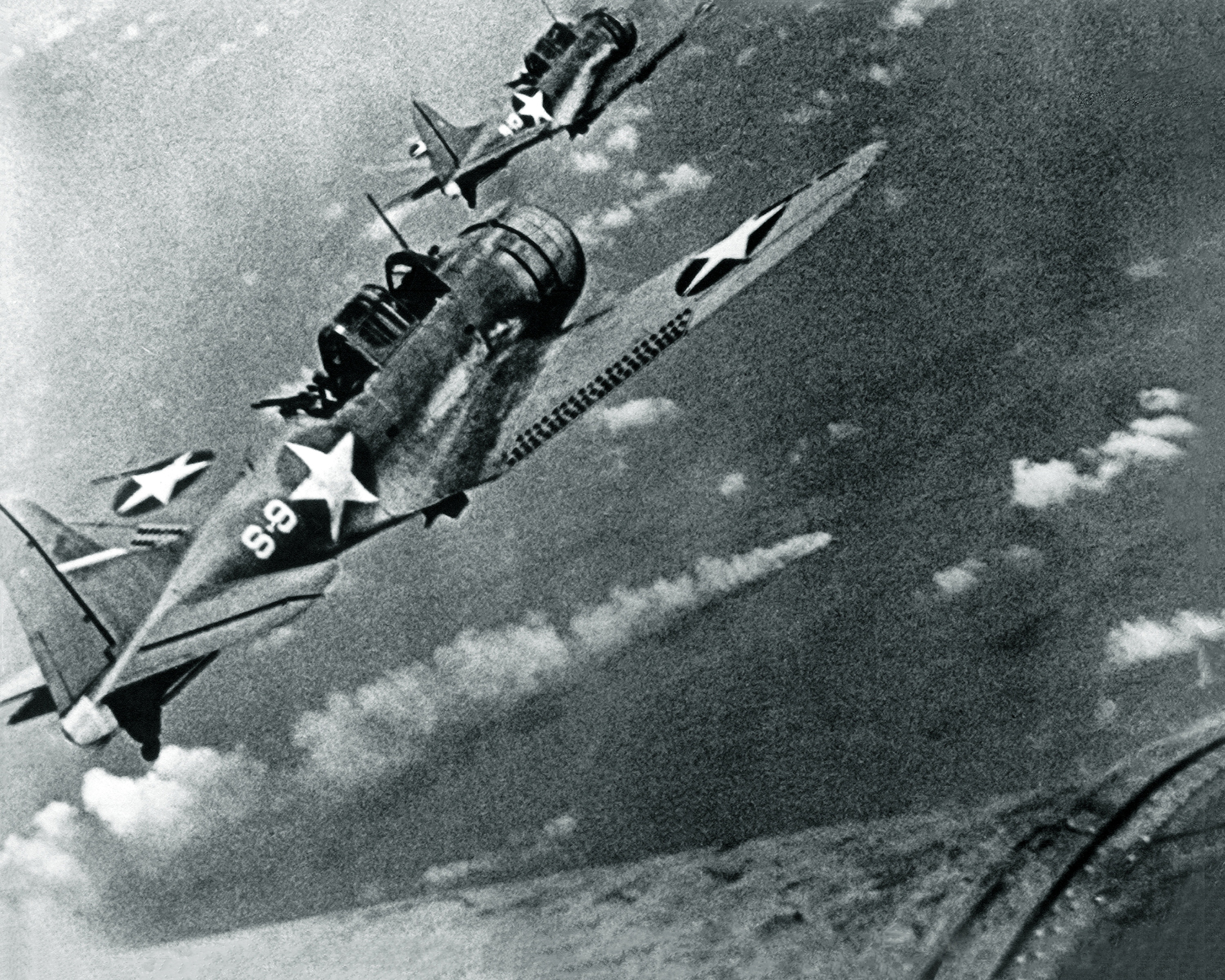 Dans le Pacifique que le vent tourne également. Après l’humiliation de Pearl Harbor, les États-Unis se réorganisent à une vitesse vertigineuse. L’industrie de guerre américaine, colossale, commence à produire massivement chars, camions, avions, porte-avions, destroyers… La marine se réarme, les marines s’entraînent, la stratégie s’affine. Le 4 juin 1942, les Japonais, qui veulent tendre un piège aux forces américaines à Midway, se heurtent à une riposte éclair. Grâce au décryptage des codes japonais, les Américains anticipent l’attaque et infligent une défaite écrasante à la flotte impériale. Quatre porte-avions japonais sont coulés. Le Japon perd là sa capacité offensive navale. La bataille de Midway, qui dure du 4 au 7 juin 1942, est le Stalingrad du Pacifique.