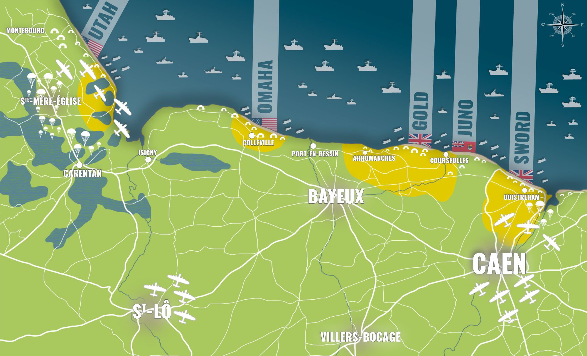 Le débarquement amphibie commence alors sur cinq secteurs répartis le long de la côte normande. À l’extrême ouest, les troupes américaines prennent pied sur Utah Beach, dans le Cotentin. Grâce à une erreur de navigation, elles débarquent légèrement au sud de la zone prévue, sur une portion de plage moins bien défendue. Ce coup du sort leur est favorable : les pertes sont légères, et les troupes