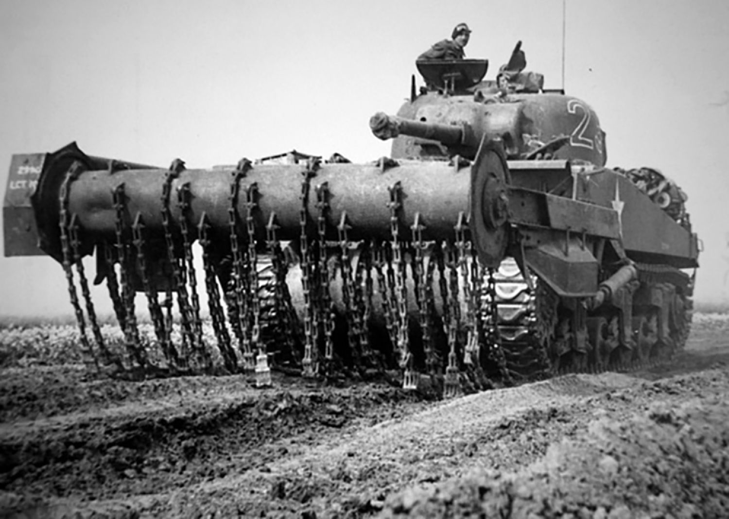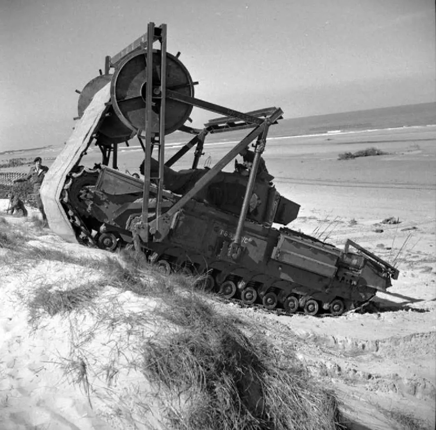 L’un des apports les plus singuliers du Débarquement fut l’usage des véhicules spécialisés de la 79e division blindée britannique, connus sous le nom de « Hobart’s Funnies », du nom de leur concepteur, le général Percy Hobart. Conçus pour surmonter les obstacles redoutables du Mur de l’Atlantique, ces blindés expérimentaux comprenaient des chars lance-flammes pour neutraliser les bunkers, des chars de déminage équipés de fléaux rotatifs pour faire exploser les mines, des bulldozers blindés pour dégager les obstacles, des chars poseurs de ponts, ou encore des véhicules déroulant des tapis renforcés afin de permettre aux autres engins de circuler sur des terrains meubles. D’abord moqués pour leur apparence étrange, ces véhicules jouèrent un rôle décisif dans la réussite du Débarquement sur les plages britanniques et canadiennes, notamment à Gold et Sword. Leur efficacité contraste avec les pertes subies sur Omaha Beach, où les forces américaines, plus réticentes, n’en firent pas usage.