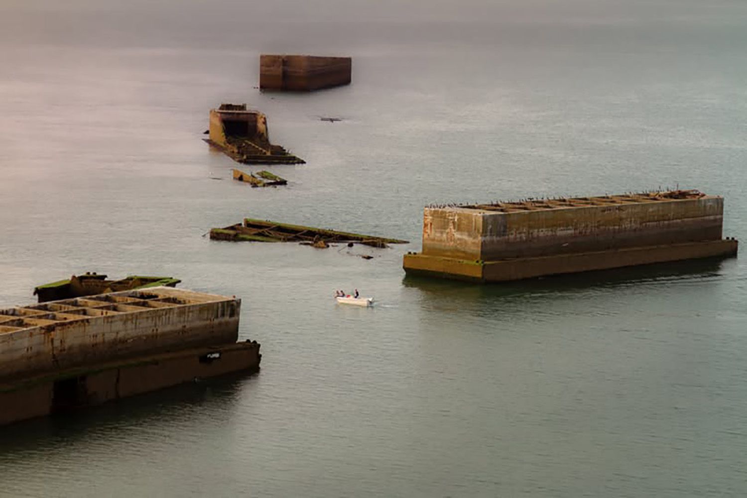 C’est ainsi que naît l’idée audacieuse des Mulberries : deux ports artificiels démontables, transportables et assemblés directement sur les plages une fois la tête de pont établie. Des centaines de morceaux préfabriqués — quais flottants, digues, jetées, routes flottantes, plateformes de débarquement — sont construits en Grande-Bretagne, puis remorqués à travers la Manche, comme des pièces de Lego géants, avant d’être assemblés au large d’Arromanches (Gold Beach) pour les Britanniques, et de Saint-Laurent-sur-Mer (Omaha Beach) pour les Américains.